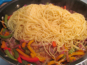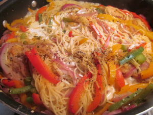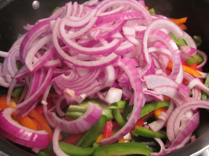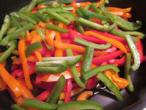 Saute peppers, onions, and garlic in a large deep skillet over medium heat with a couple tablespoons of olive oil.