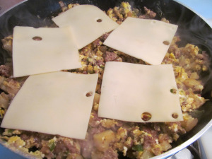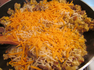 Add the cheese and mix it all together. I needed to use up some Swiss cheese today so it got put into the mix too! :)
