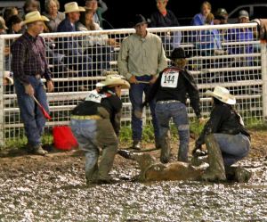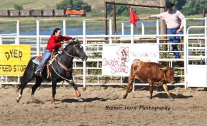 Calf Branding – 3 Minute Time Limit. There is one roper, one brander, and two gals to hold the calves down. The roper goes in and snags a calf by one or both hind legs. She drags it out where one gal tails the calf down and the other has the rope. Once the rope is removed the brander is signaled. She runs over and “brands” the calf with a branding iron that has powder on it. Once the calf is “branded” it is let up and the roper goes back in for the second calf. Everything is repeated. Once the second calf is “branded” time is called.