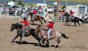 Trailer Loading – 2 Minute Time Limit. Cattle with numbers on them will be located at the end of the arena behind a chalk line. Time starts when the first team member crosses the score line. Any team member can sort, but only one rider can be in the herd at a time. While riding towards the herd, the number of the steer to be sorted and loaded will be called out over the loud speaker. This steer must be cut out from the herd and taken across the line. The steer is then trailed to the trailer and loaded in the first compartment and the door is shut. One team member’s horse is then loaded in the second compartment. Once the door is shut and latched all team members must run to a designated spot near the judge. Once there, the judge calls for time.