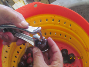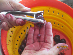 The biggest thing to worry about when working with fresh cherries is removing the pits. Almost 10 years ago I somehow acquired a Pampered Chef Cherry Pitter. It was probably when I was a consultant for the company....who knows, but I remembered that I had it and thought it would come in handy. Boy, did it ever!!! That is one of the handiest tools ever! Shane helped me by taking a picture of the before and after process: