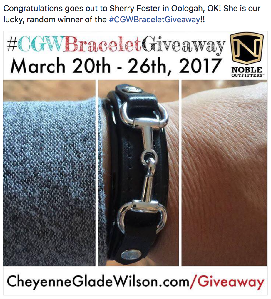 Congratulations goes out to: Sherry Foster in Oologah, OK! Sherry - please message me with your bracelet color choice and you will soon receive it in the mail from Noble Outfitters.